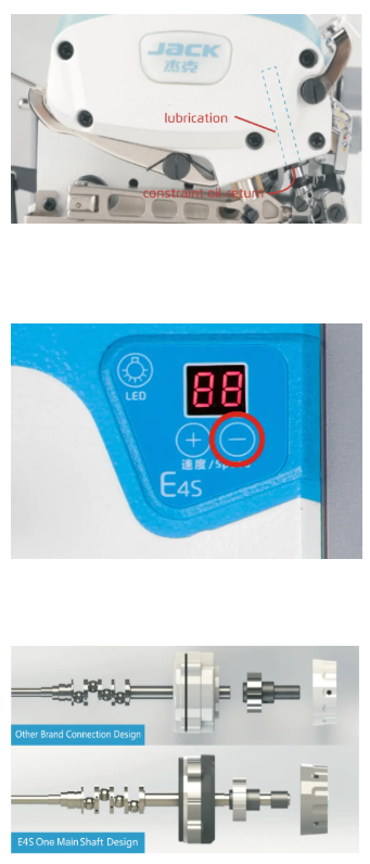 Serija Jack E4S vključuje napredne 3-, 4- in 5-nitne overlock stroje, zasnovane za učinkovitost, natančnost in enostavno uporabo. Opremljen je z integriranim energetsko varčnim motorjem, nameščenim neposredno na glavni gredi (sistem neposrednega pogona), ki zagotavlja tiho, zanesljivo delovanje in znatno zmanjšano porabo energije.